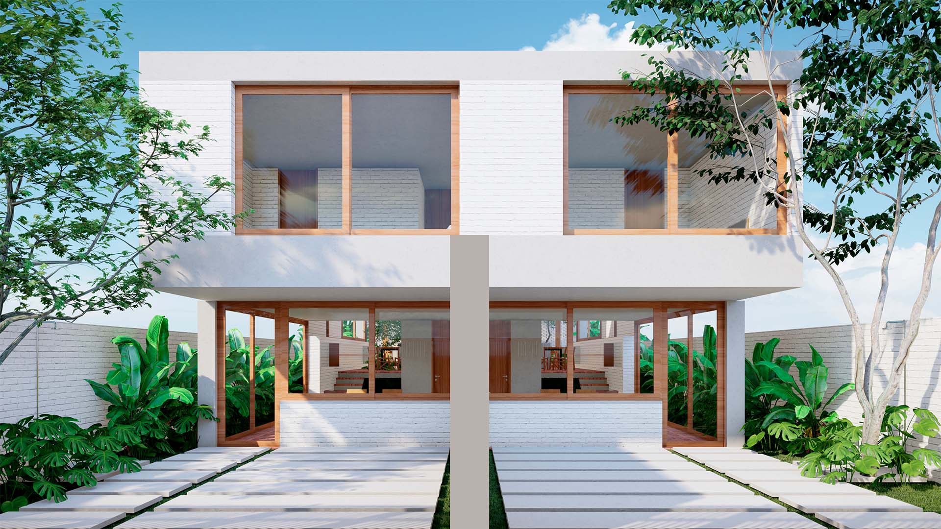 Casas geminadas e densidade de ocupação. Níveis e vazio interno procuram integrar os espaços da casa