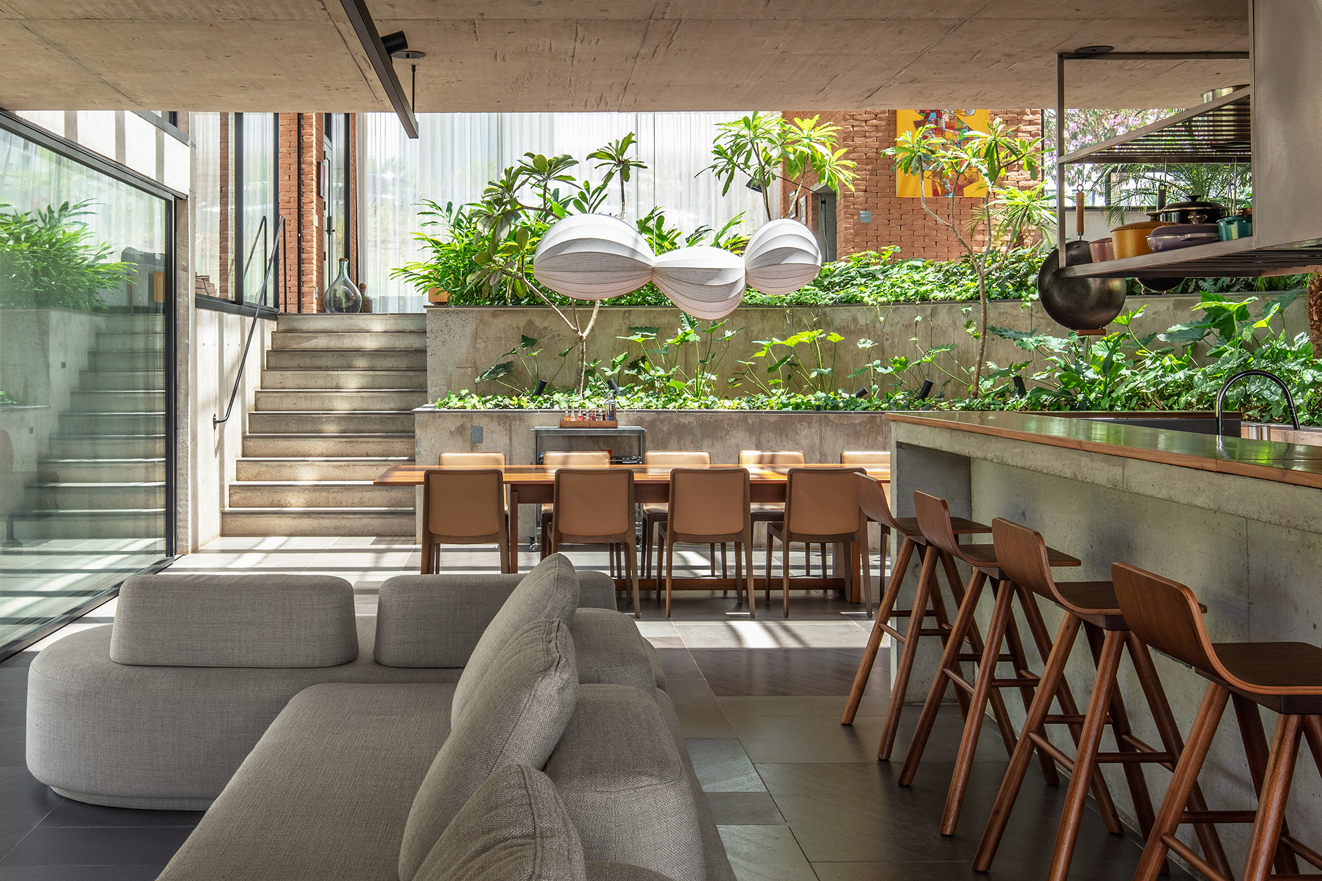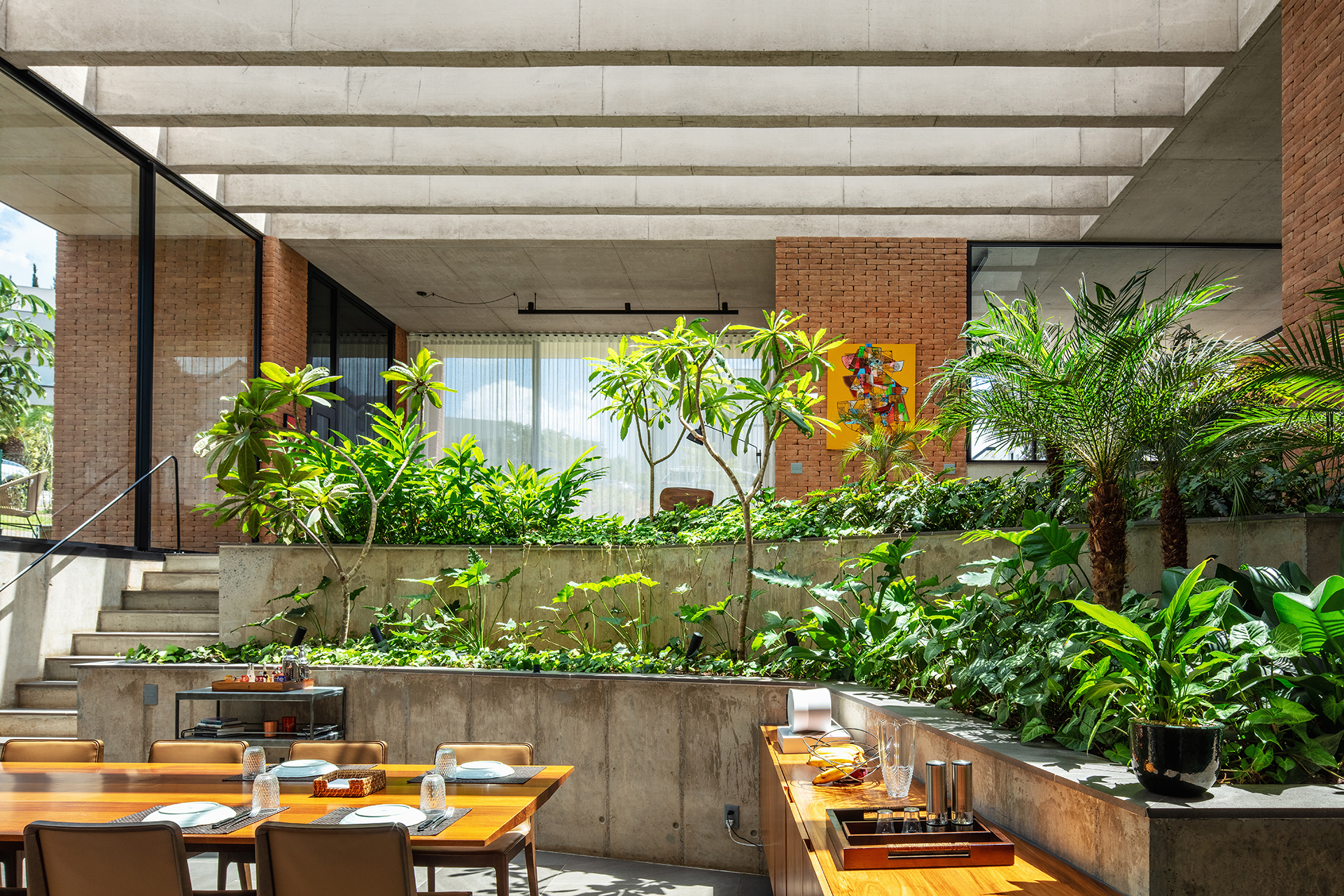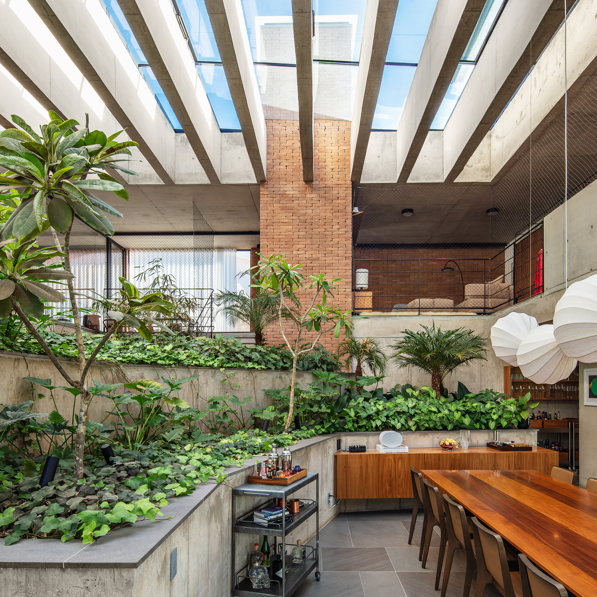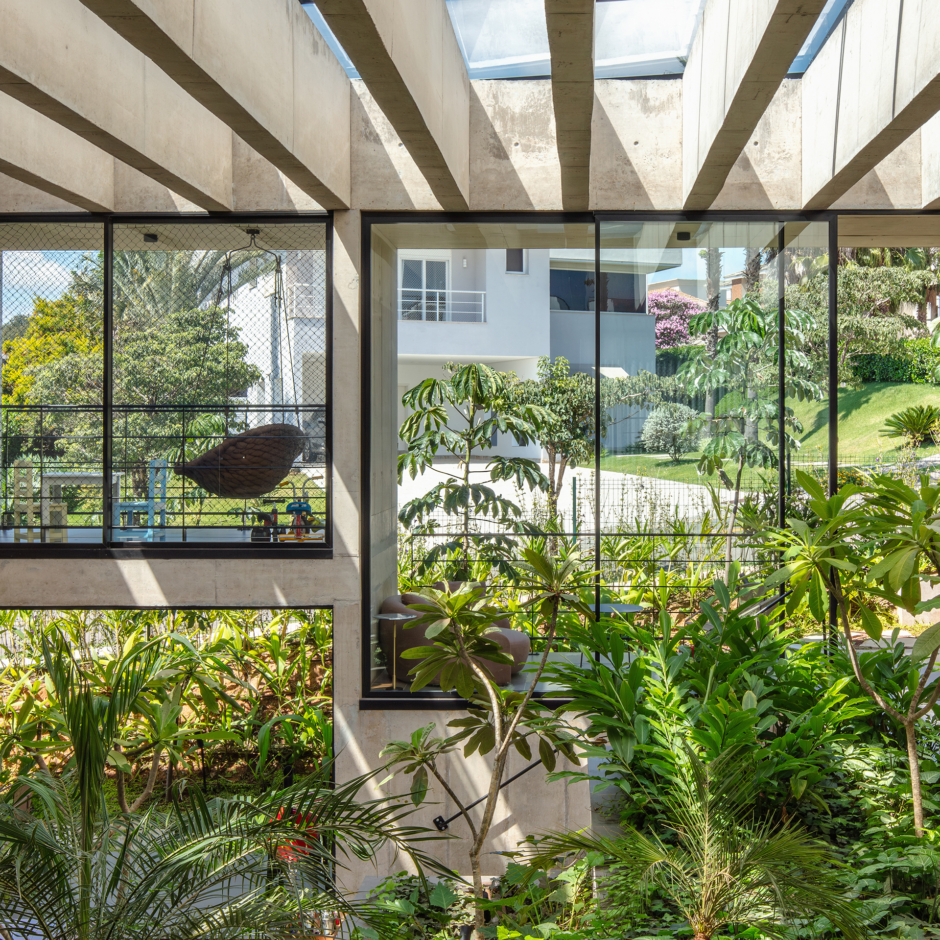 A pérgola central, em concreto armado e coberta com vidro, amplia a entrada de iluminação natural na residência. O elemento conta com aberturas zenitais que favorecem a ventilação natural, além de uma cobertura em lona retrátil, projetada para o sombreamento do vidro e a melhoria do conforto térmico.