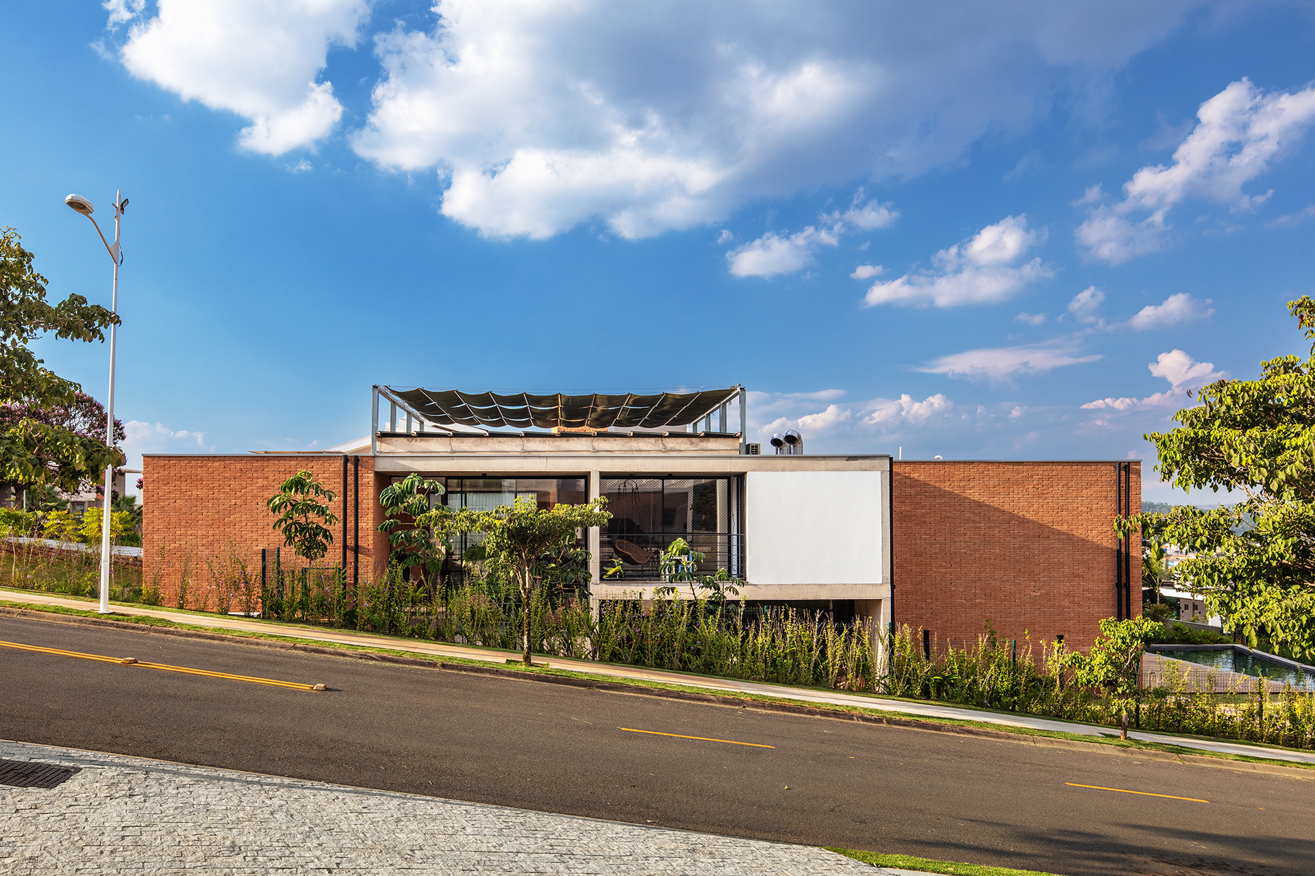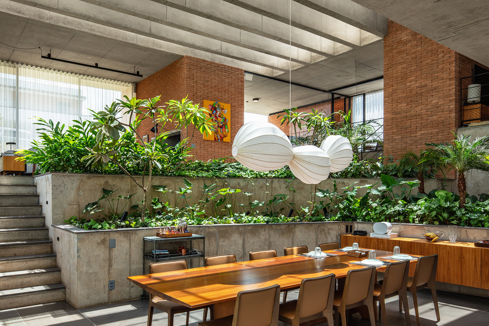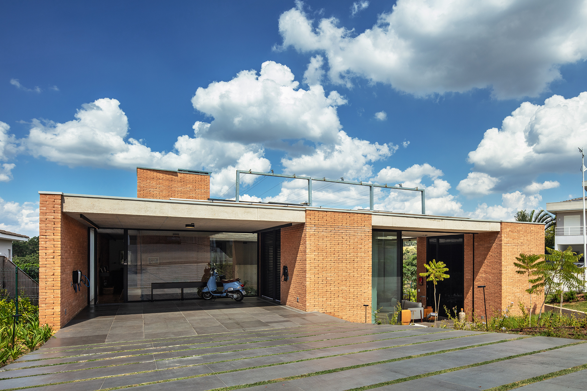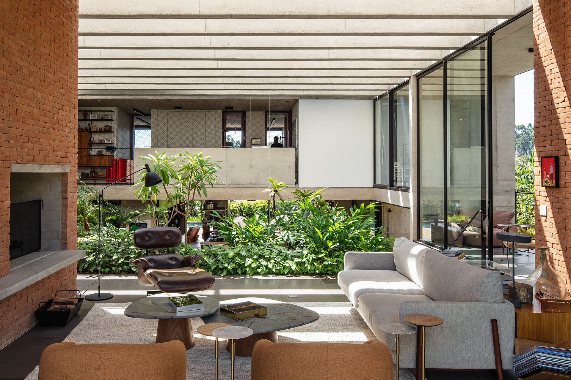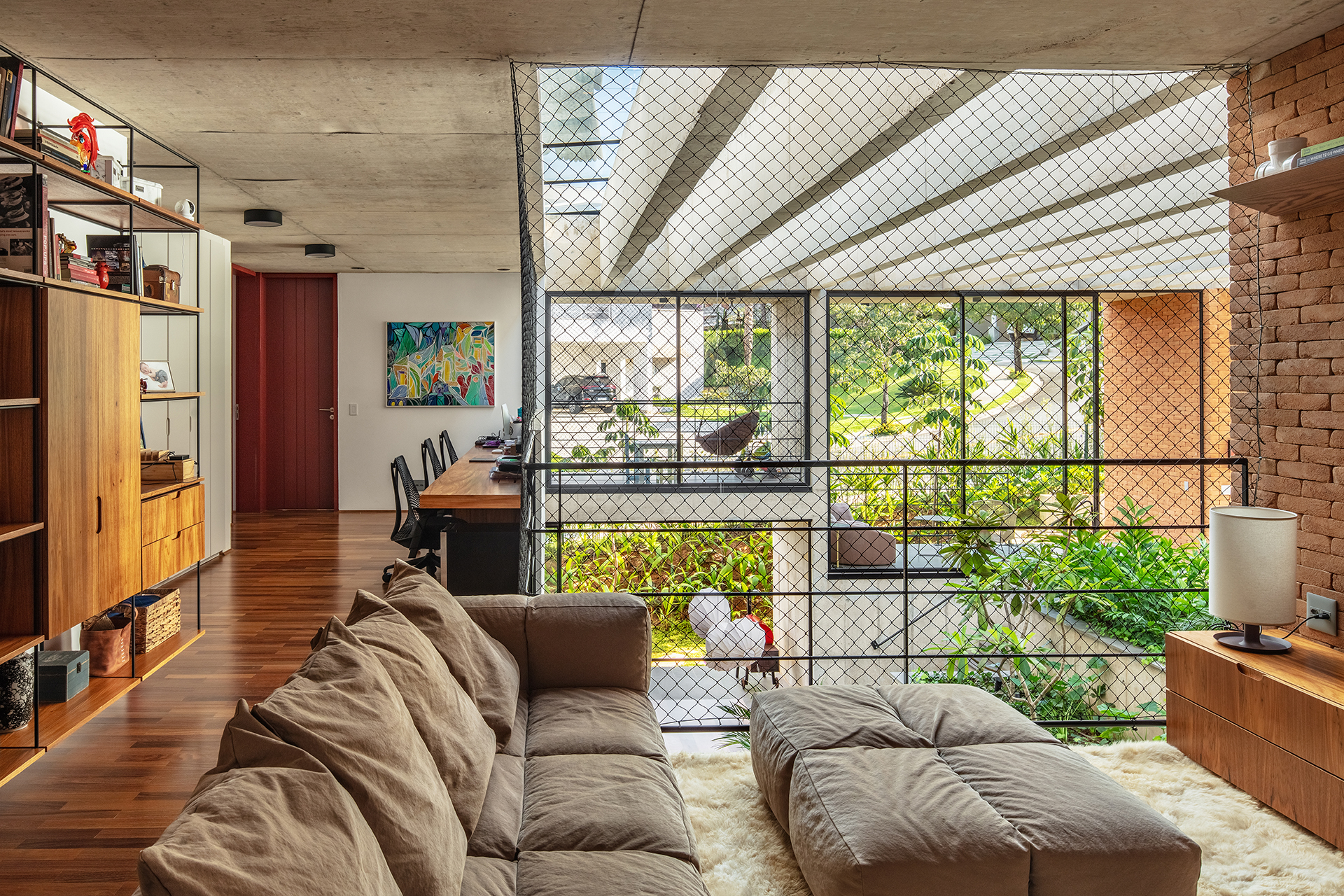 A pérgola central, em concreto armado e coberta com vidro, amplia a entrada de iluminação natural na residência. O elemento conta com aberturas zenitais que favorecem a ventilação natural, além de uma cobertura em lona retrátil, projetada para o sombreamento do vidro e a melhoria do conforto térmico.