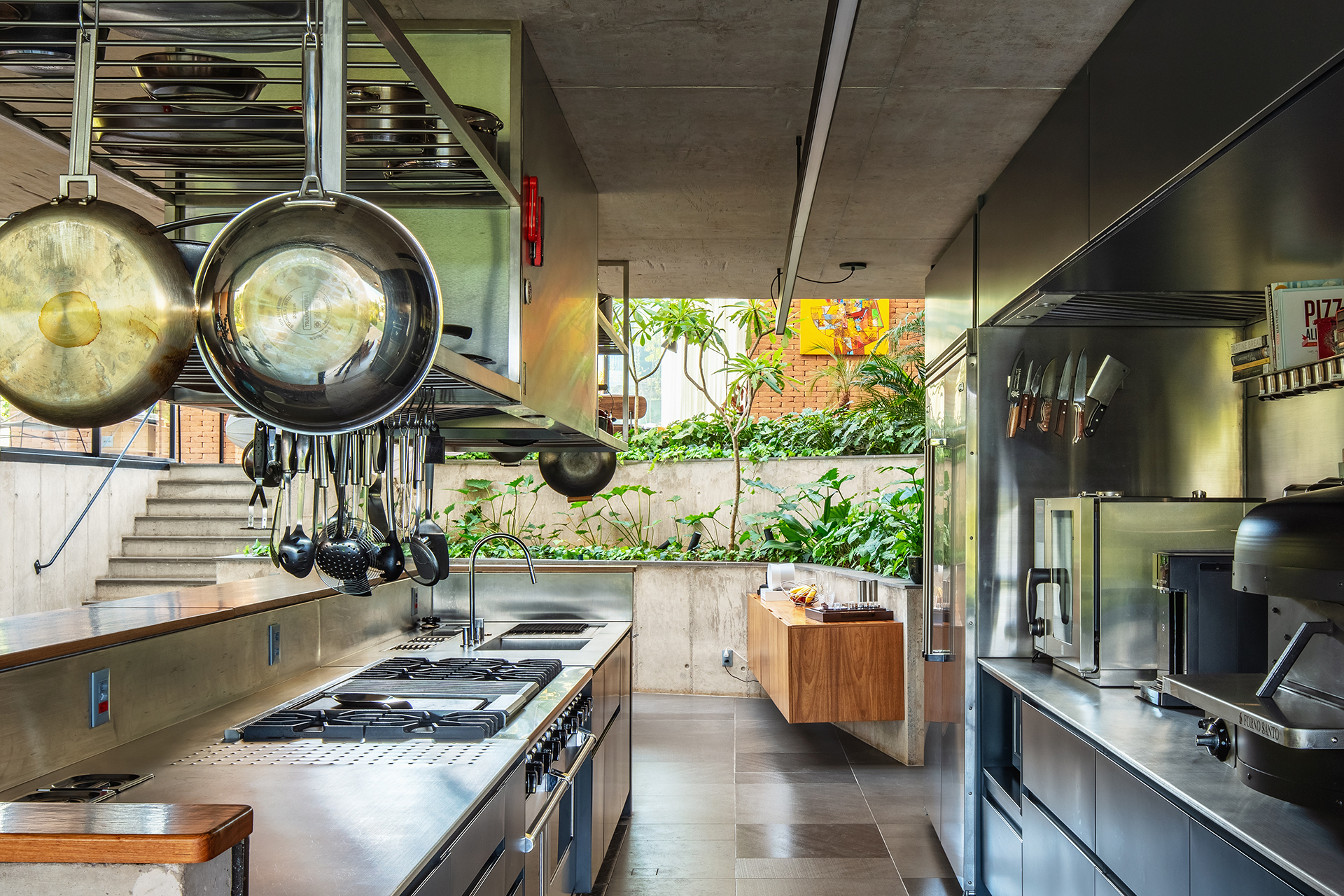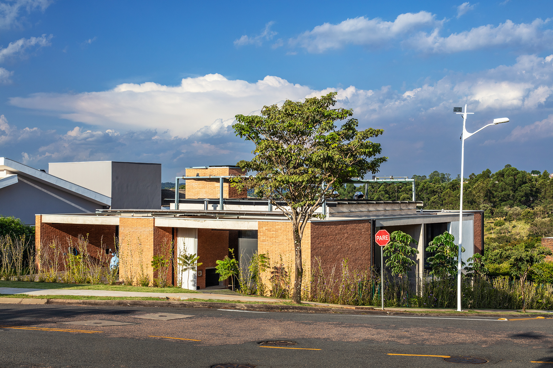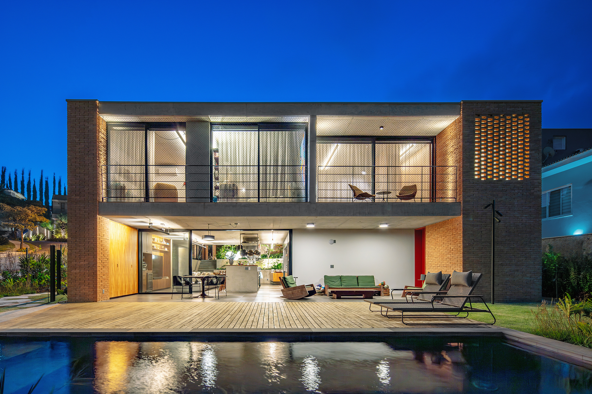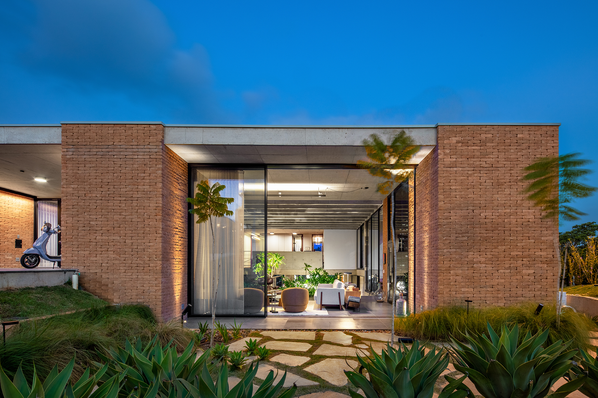A pérgola central, em concreto armado e coberta com vidro, amplia a entrada de iluminação natural na residência. O elemento conta com aberturas zenitais que favorecem a ventilação natural, além de uma cobertura em lona retrátil, projetada para o sombreamento do vidro e a melhoria do conforto térmico.