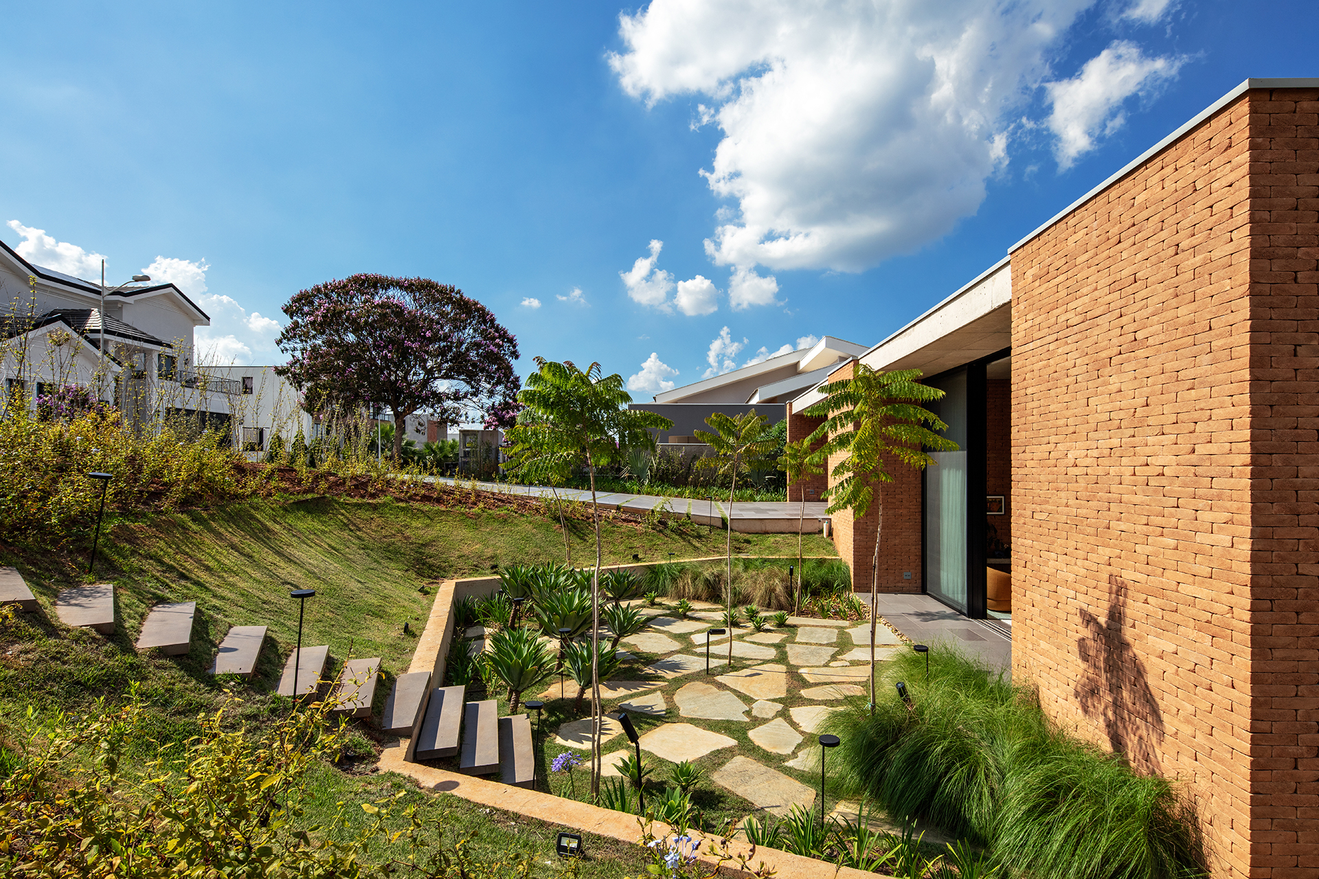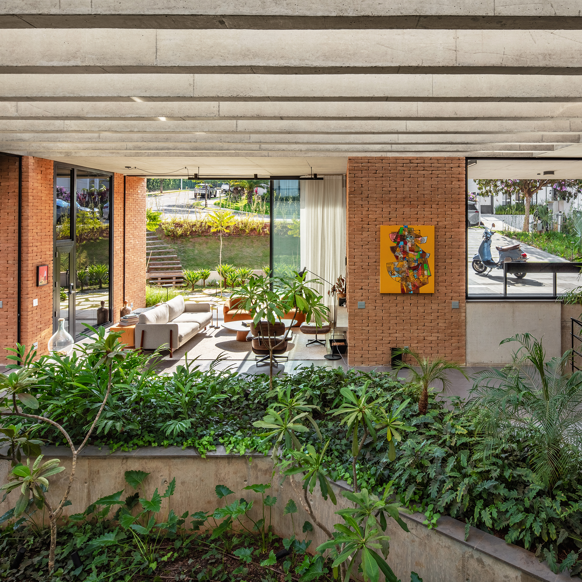 Em contraposição a esse contexto, buscou-se elaborar um projeto que, ao mesmo tempo em que preserva a intimidade dos moradores, estabelece aberturas pontuais e qualificadas para o exterior, incorporando áreas livres generosas destinadas à vegetação. Para isso, o jardim foi adotado como elemento estruturador, funcionando tanto como barreira visual quanto como organizador dos espaços da casa.