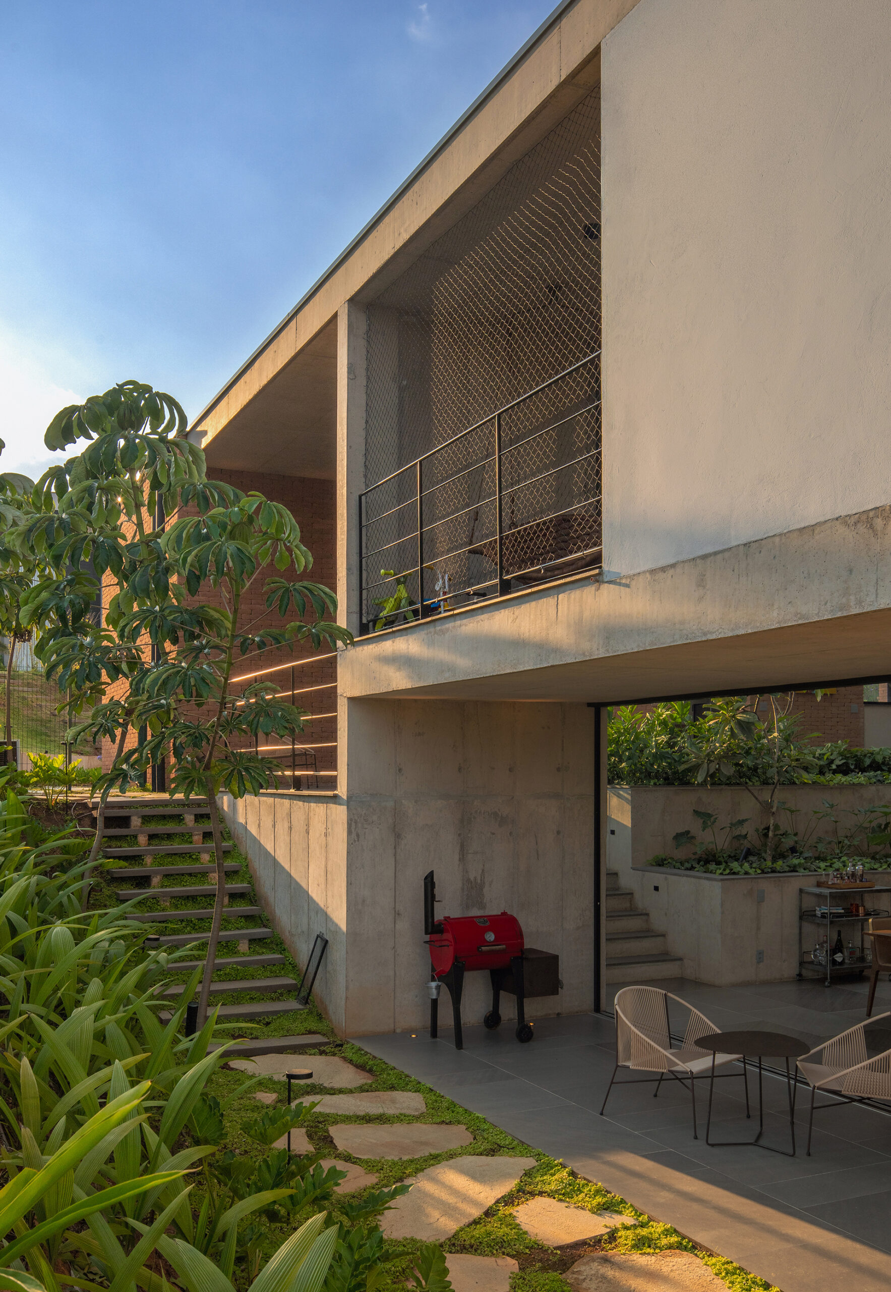 A estrutura da casa foi executada em concreto armado, solução tecnicamente adequada devido à proximidade com o solo e à presença de muros de arrimo. Além disso, a escolha do material se justifica por sua plasticidade e pela capacidade de valorizar, sem a necessidade de revestimentos adicionais, a expressão construtiva de uma execução precisa.