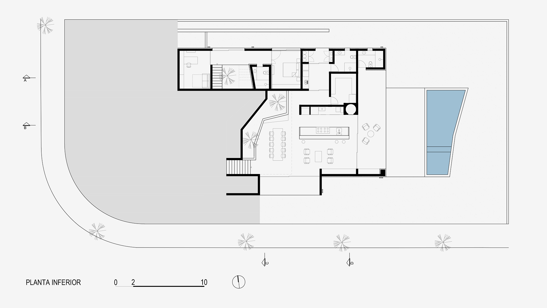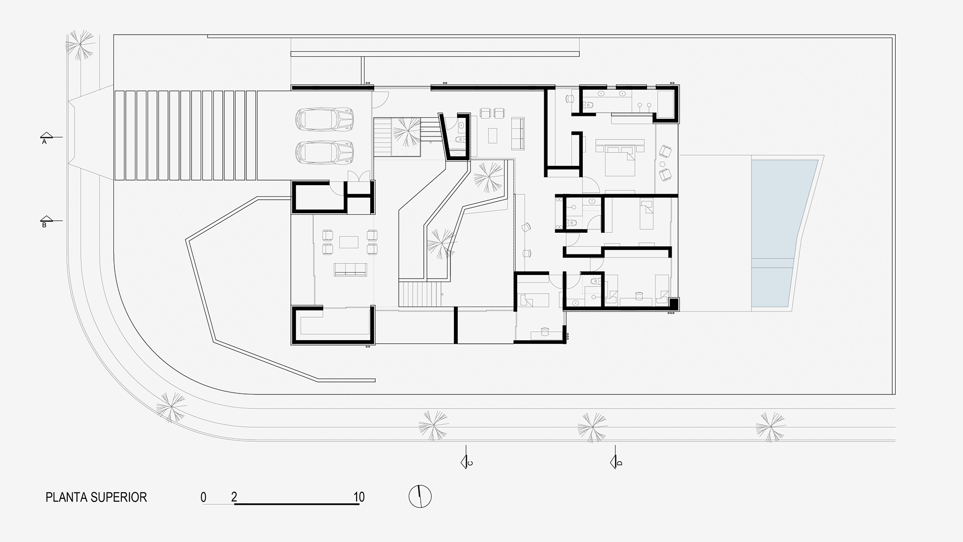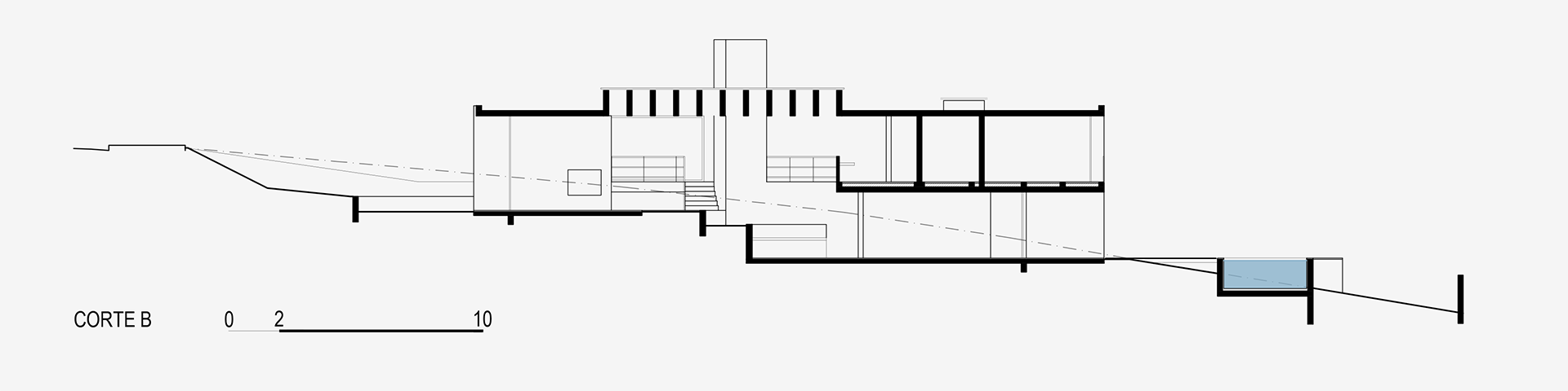 O programa foi distribuído da seguinte maneira: no nível intermediário, localizam-se a adega e a sala de estar, ambas com amplas visuais para os jardins interno e externo. No nível superior, encontra-se a área mais íntima da residência, composta por um espaço de convivência e quatro dormitórios, que se beneficiam da posição elevada e do contato com o exterior por meio de varandas. Já no nível inferior, concentram-se a cozinha, a sala de jantar, os serviços, a varanda e a piscina — ambientes voltados ao lazer e à convivência social.