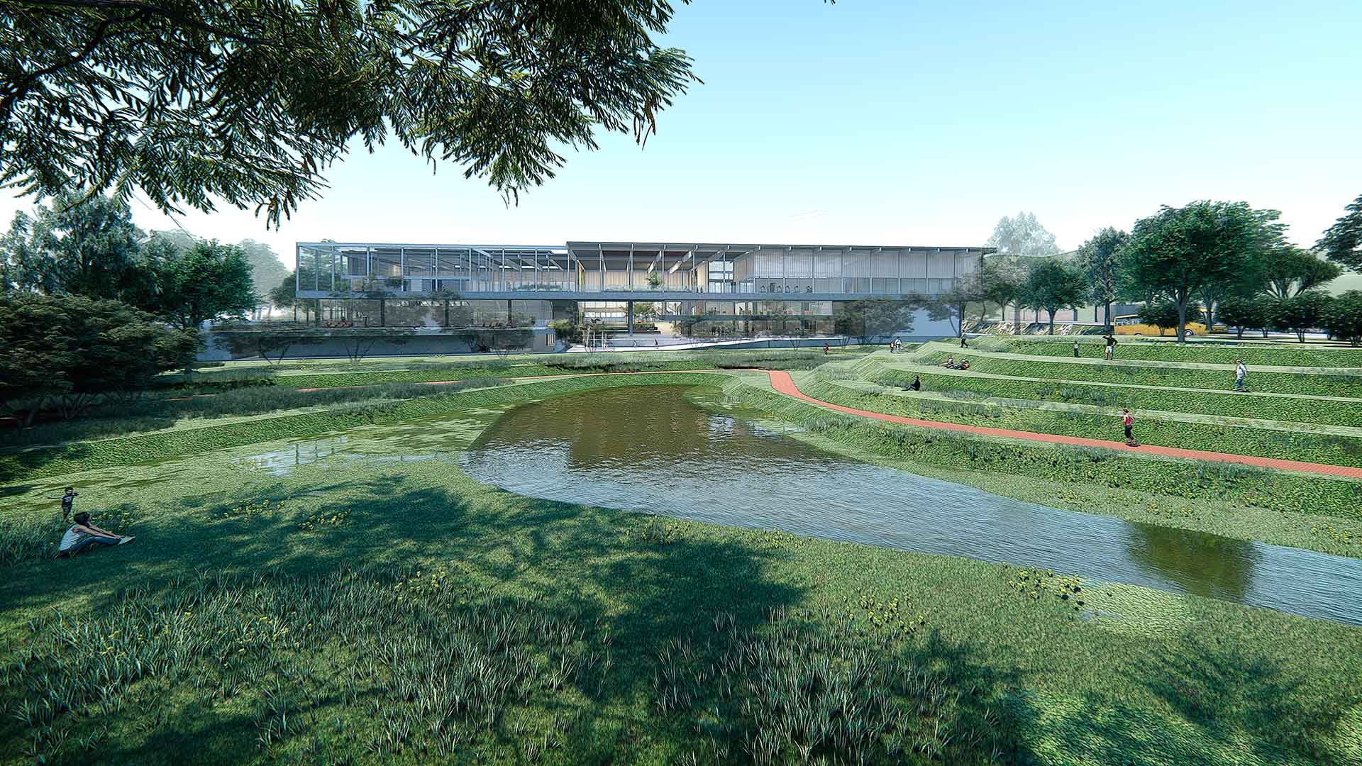 A condição específica de Mogi das Cruzes, com o Rio Tietê e sua várzea cruzando grande parte do território da cidade bem como a extensa produção agrícola local, apresenta uma oportunidade de expansão do programa de caráter ambiental sugerido. Neste sentido a área liberada de edificações se converte num grande espaço verde, de caráter experimental, educacional e infra-estrutural. A ideia norteadora do parque é que ele possa se converter em modelo de como as infraestruturas podem ser pensadas como ricos espaços de vivência e como o plantio produtivo pode se converter em uma paisagem rica, biodiversa e bela. O parque proposto parte, portanto, da necessária desaceleração das águas de chuva, criando um corpo d’água de nível variado, que retenha a água antes de despejá-la na rede pública, mas não apenas isso, que se converta em grande reservatório para irrigação das áreas verdes nos períodos de estiagem.