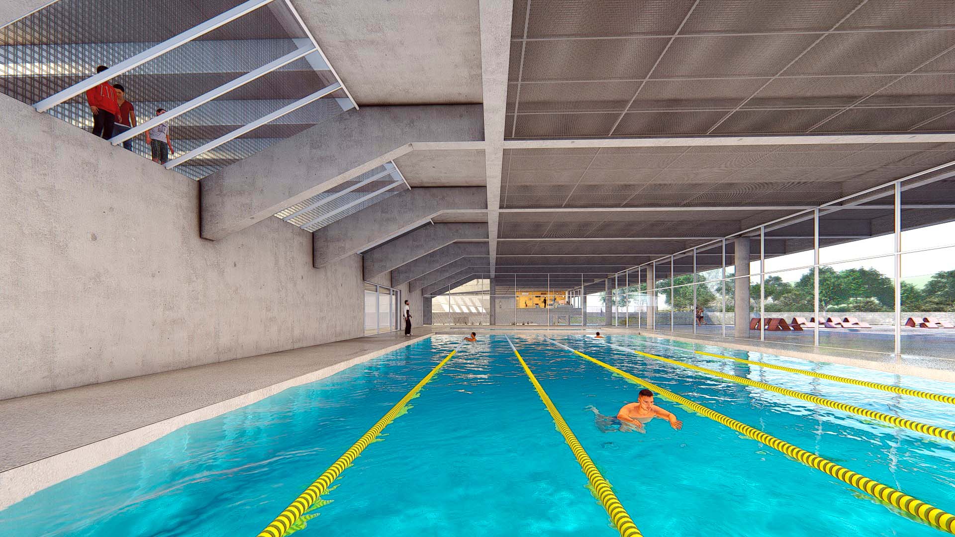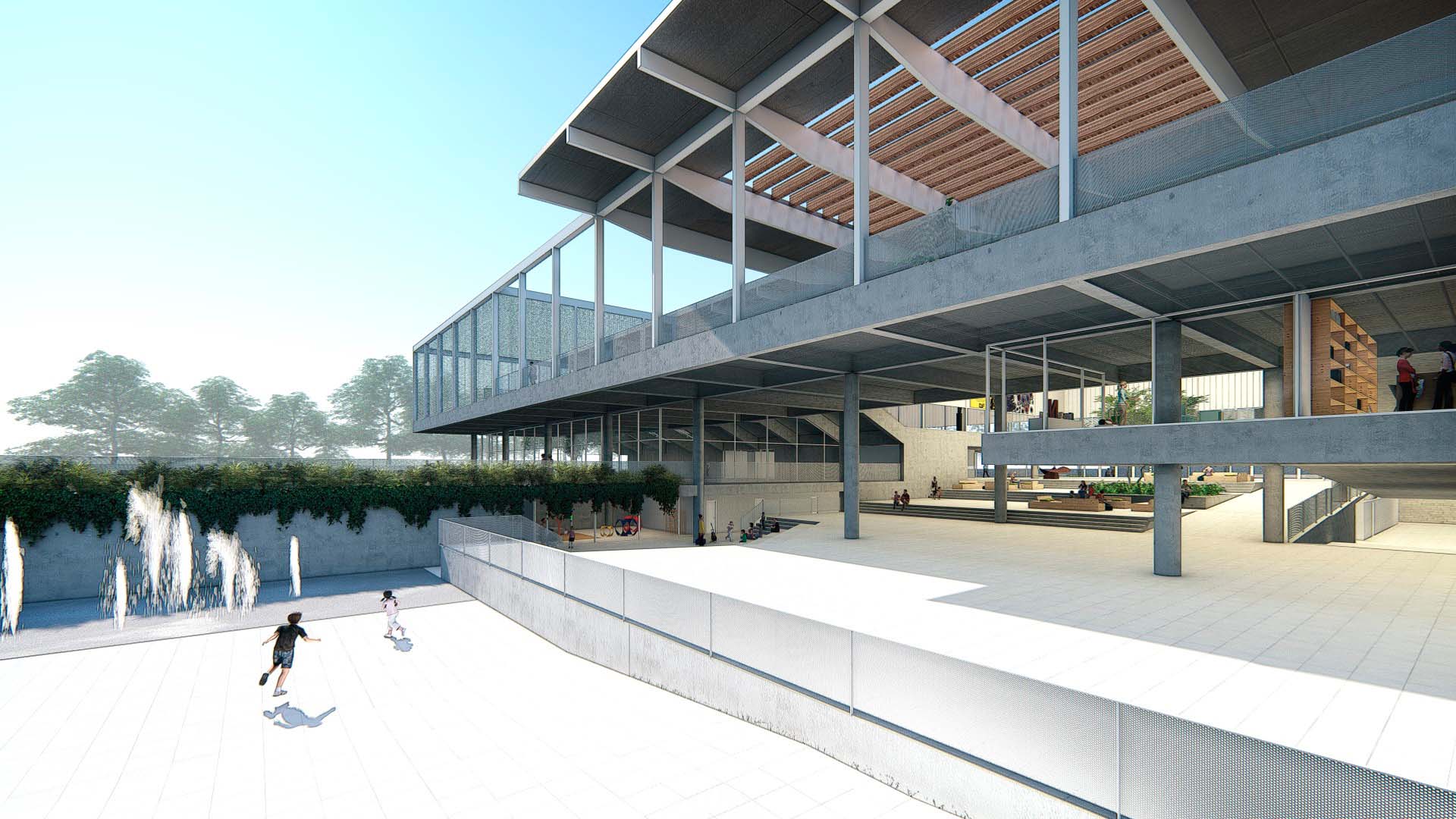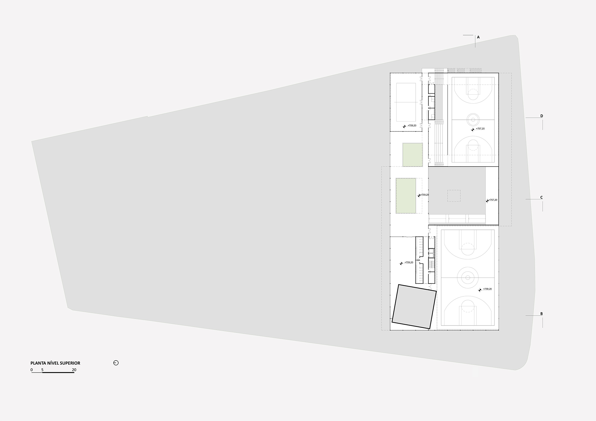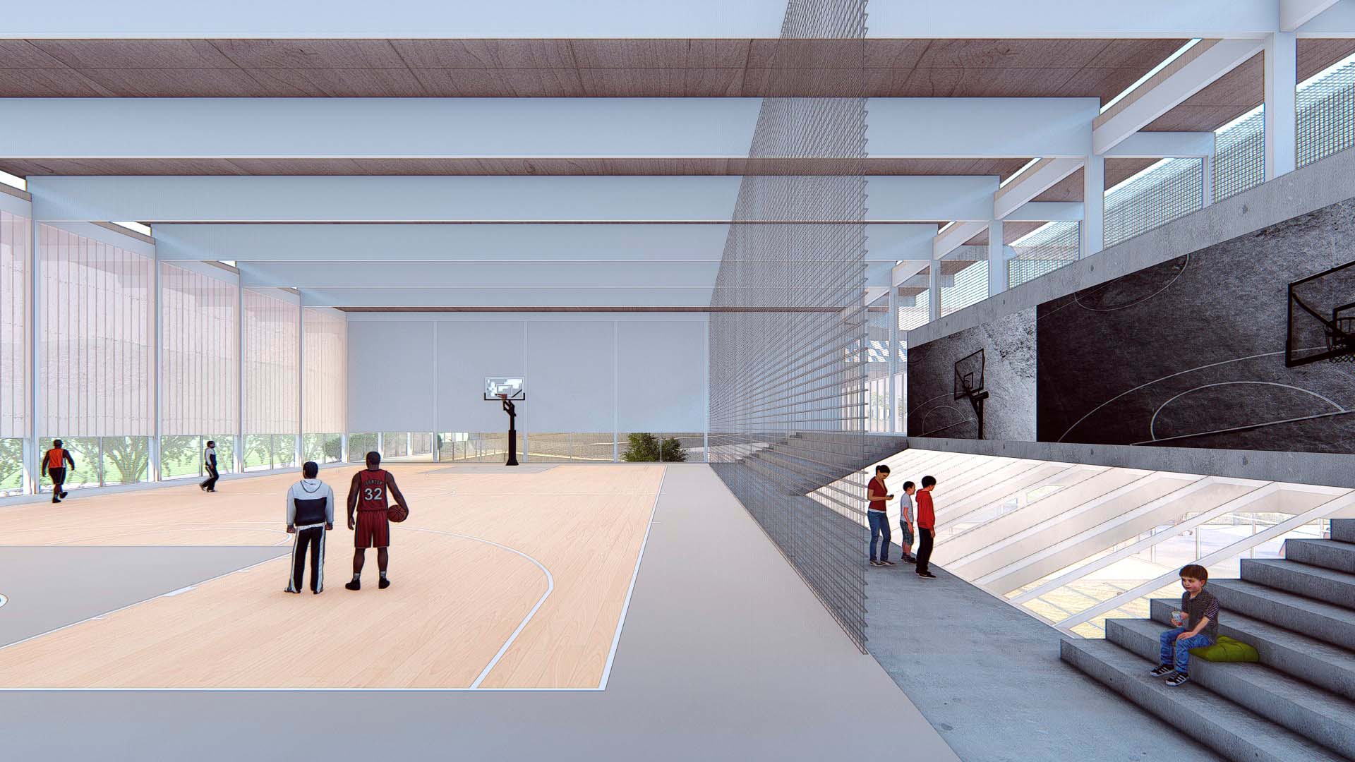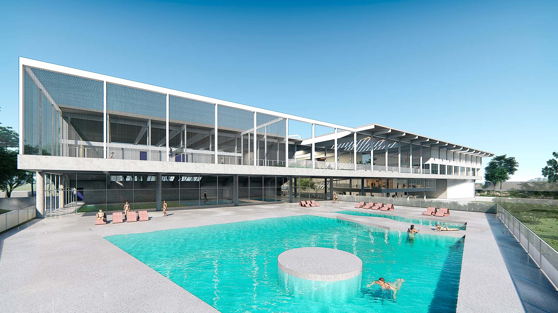 Verticalmente, optou-se por dispor as quadras todas, inclusive as descobertas, no pavimento mais alto do conjunto construído, de forma a estender a superfície do parque sobre a área edificada, o que trouxe duas vantagens: