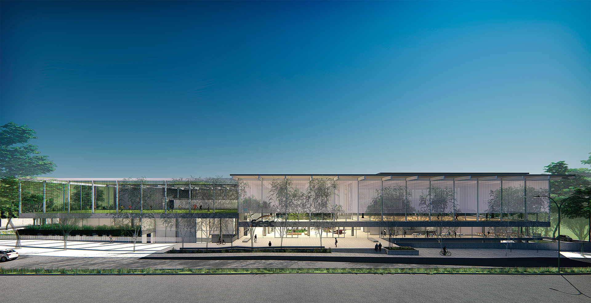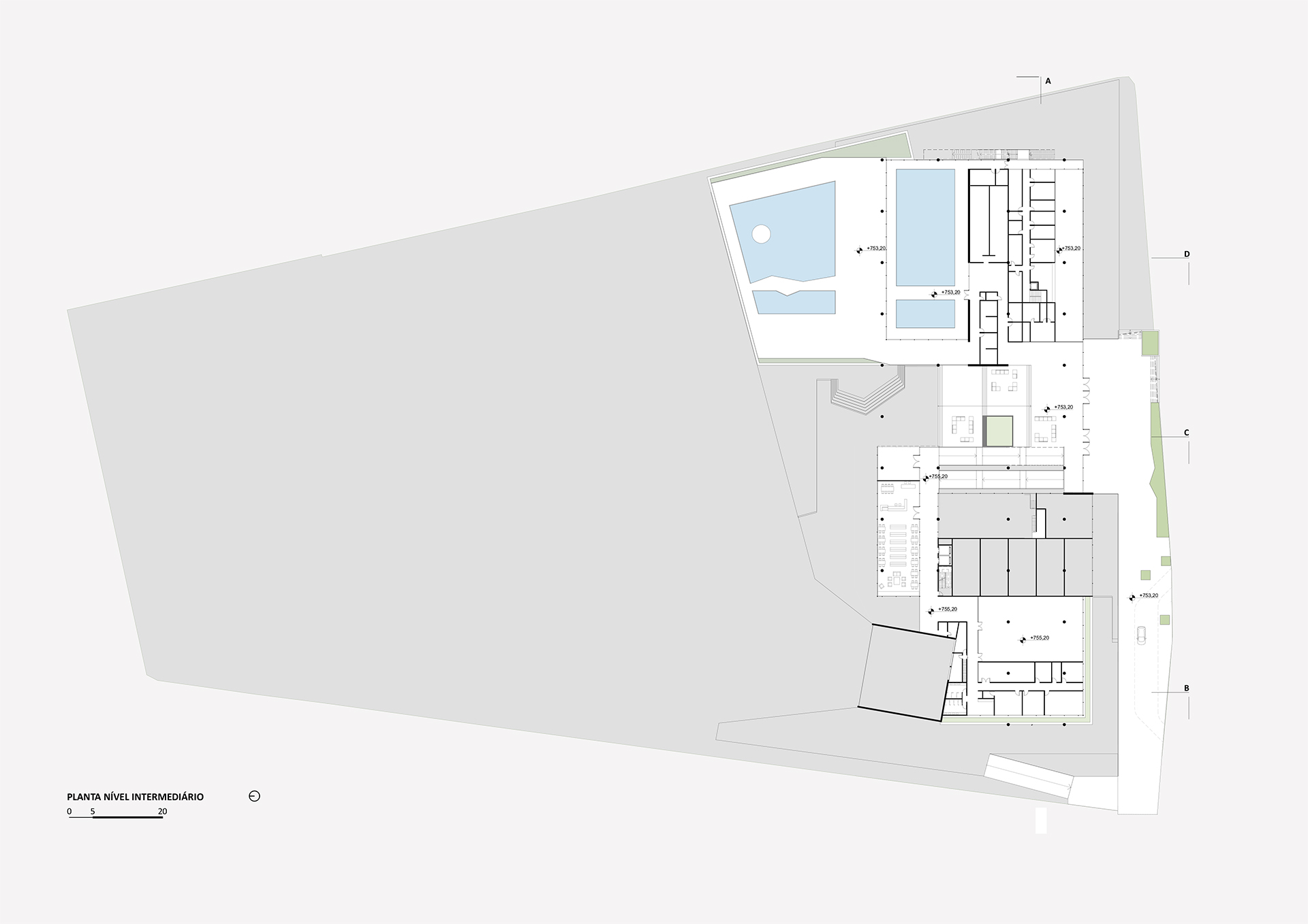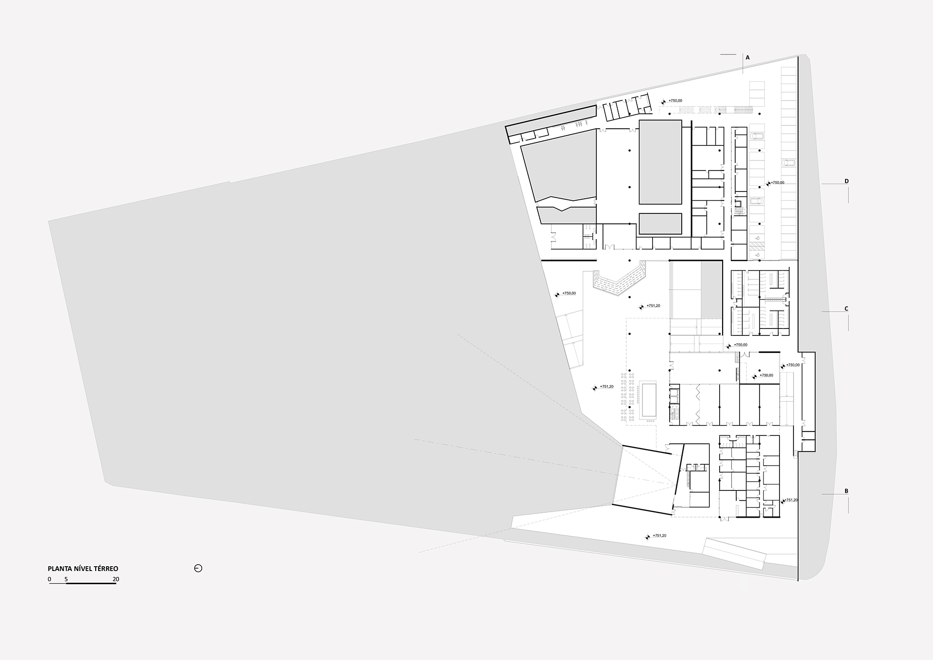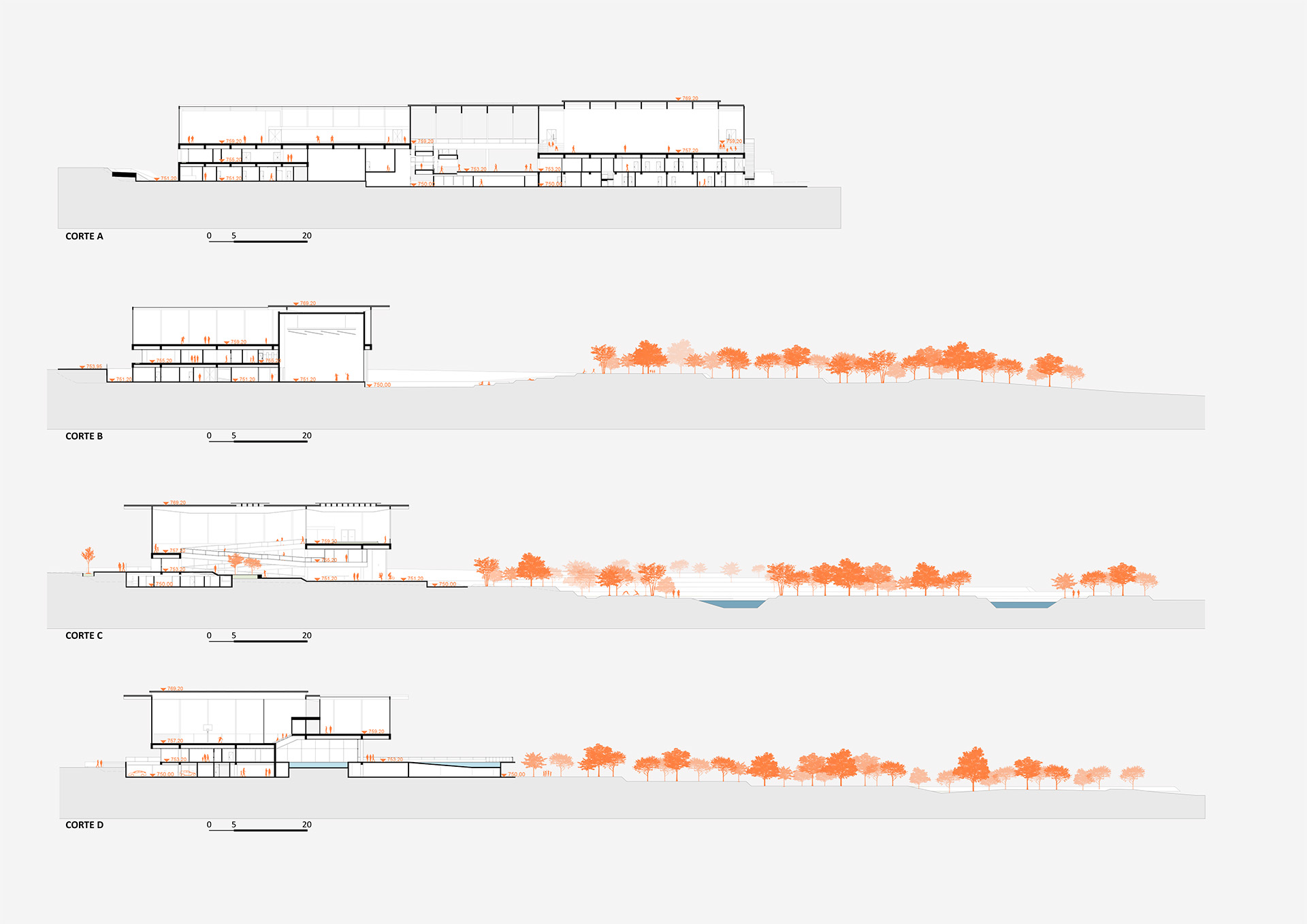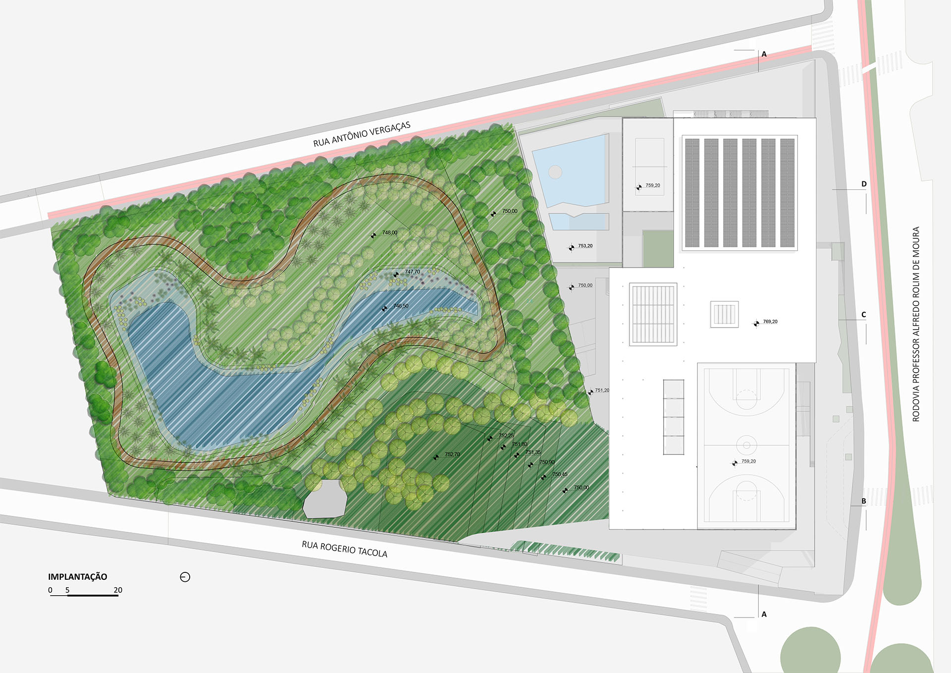 Em plano, optou-se por agrupar o corpo edificado junto à Rodovia, de forma a marcar a presença do edifício na paisagem urbana, expondo as atividades internas para o grande número de pessoas que transitam no local. Por outro lado, além de liberar extensa área para o parque, o conjunto edificado passa a funcionar como uma barreira acústica, protegendo o interior do lote do ruído da avenida, criando uma atmosfera agradável para as atividades ao ar livre.
